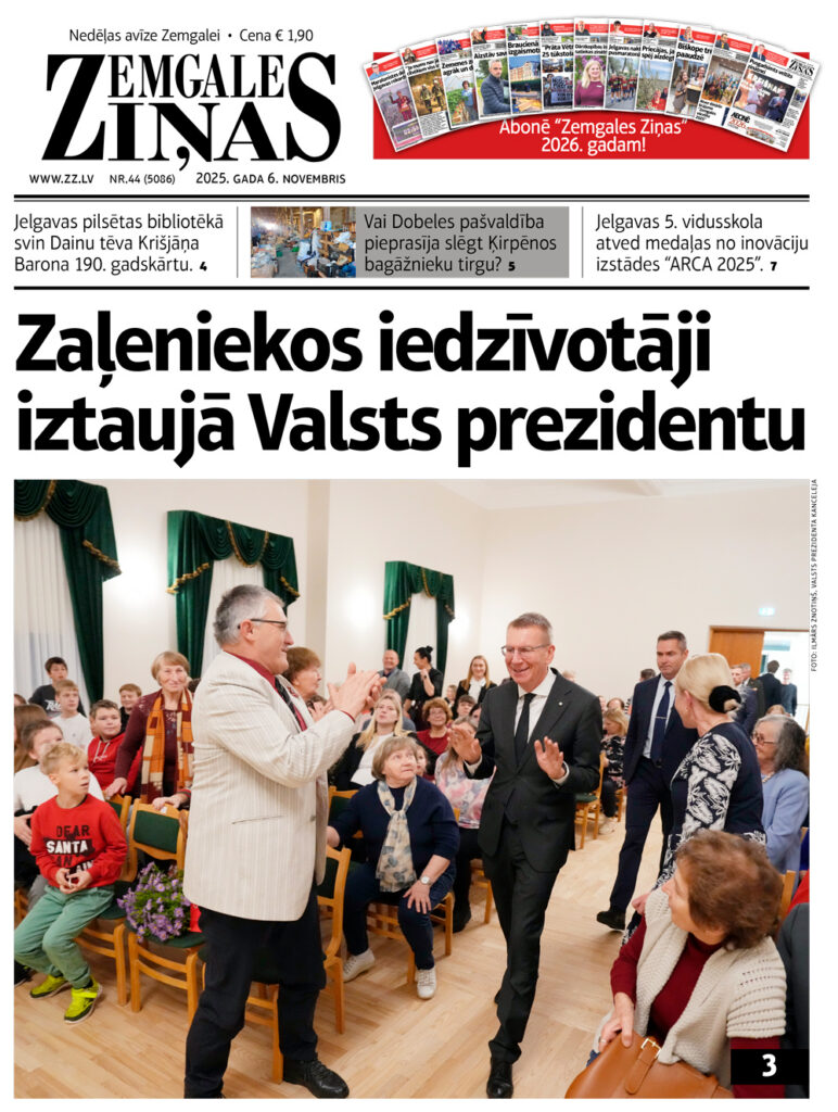Jaunākajā laikraksta “Zemgales Ziņas” numurā (06.11.2025) lasiet: *Jelgavas pilsētas bibliotēkā svin Dainu tēva Krišjāņa Barona 190. gadskārtu. *Zaļeniekos iedzīvotāji iztaujā Valsts prezidentu. *Žurnālista piezīmes: Dzīvnieki nojauš, jūt un mierina. *Tilts starp cilvēku un notikumu: Jelgavnieks Matīss Kaktiņš par žurnālistiku un mērķu sasniegšanu. *Gatavojot svētkus citiem, Jelgavniece Ilze Suta no sirds izbauda katru soli.