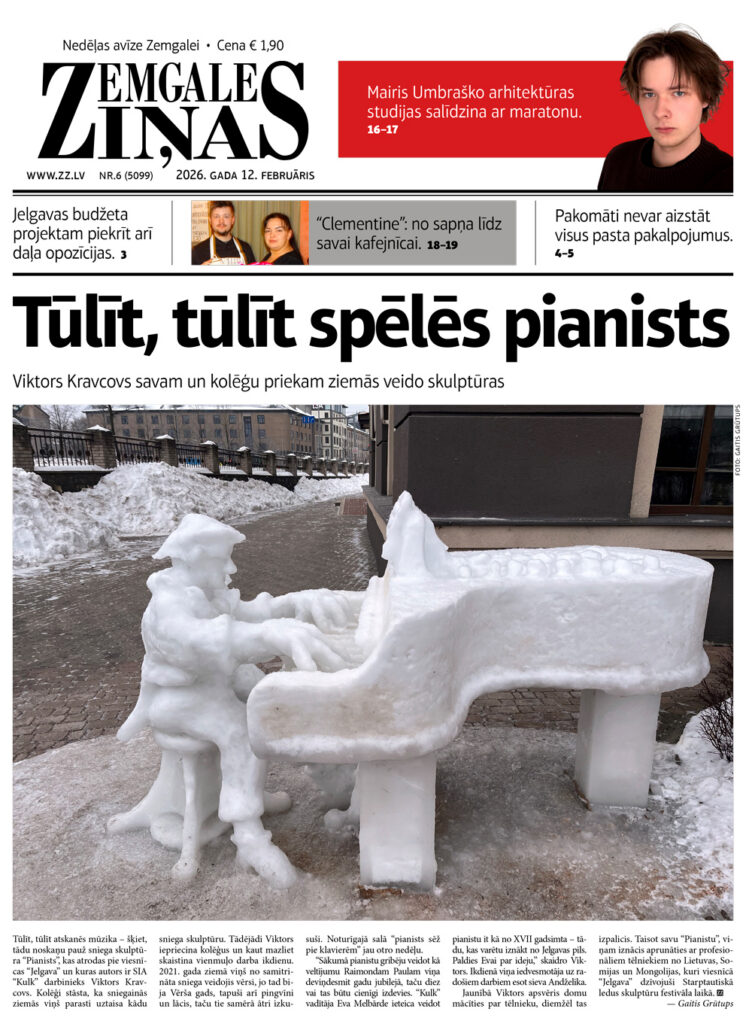 Jaunākajā laikraksta “Zemgales Ziņas” numurā (12.02.2026) lasiet: *“Clementine”: no sapņa līdz savai kafejnīcai. *Pakomāti nevar aizstāt visus pasta pakalpojumus. *Mairis Umbraško arhitektūras studijas salīdzina ar maratonu. *Šokolādes vēsturei pa pēdām: lielākais šī našķa pārdevējs pasaulē ir Briseles lidosta.