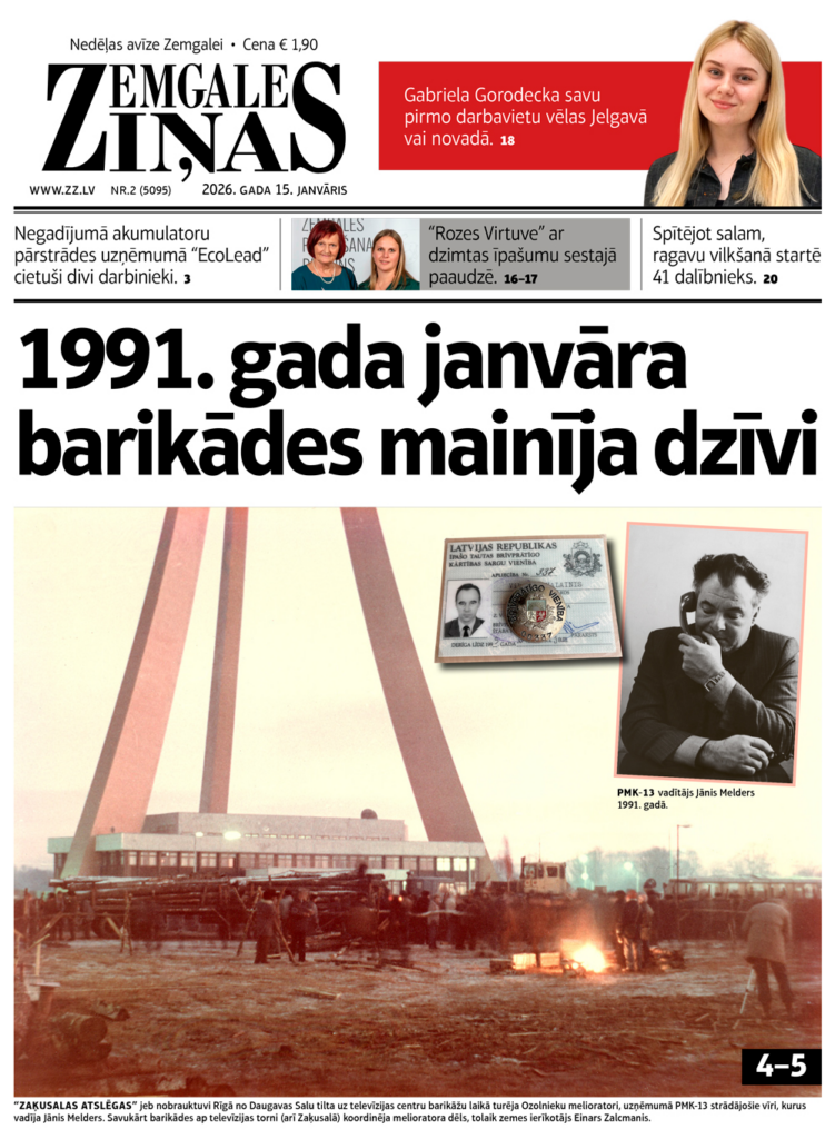 Jaunākajā laikraksta “Zemgales Ziņas” numurā (15.01.2026) lasiet: *Gabriela Gorodecka savu pirmo darbavietu vēlas Jelgavā vai novadā. *“Rozes Virtuve” ar dzimtas īpašumu sestajā paaudzē. *1991. gada janvāra barikādes mainīja dzīvi. *Uļjana Semjonova: “Es mīlu šo spēli!”
