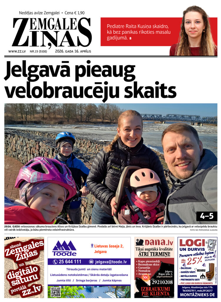 Jaunākajā laikraksta “Zemgales Ziņas” numurā (16.04.2026) lasiet: *Pediatre Raita Kusiņa skaidro, kā bez panikas rīkoties masalu gadījumā. *Jelgavā pieaug velobraucēju skaits. *Liegs izmantot tālruņus visiem pamatskolas klašu audzēkņiem. Kurš to kontrolēs? *Manas pirmās trīs brūtes jeb 1. aprīlī dzimušais humorists Andrejs Skailis. *Iedzīvotāji runās, kādā Jelgavā vēlas dzīvot.
