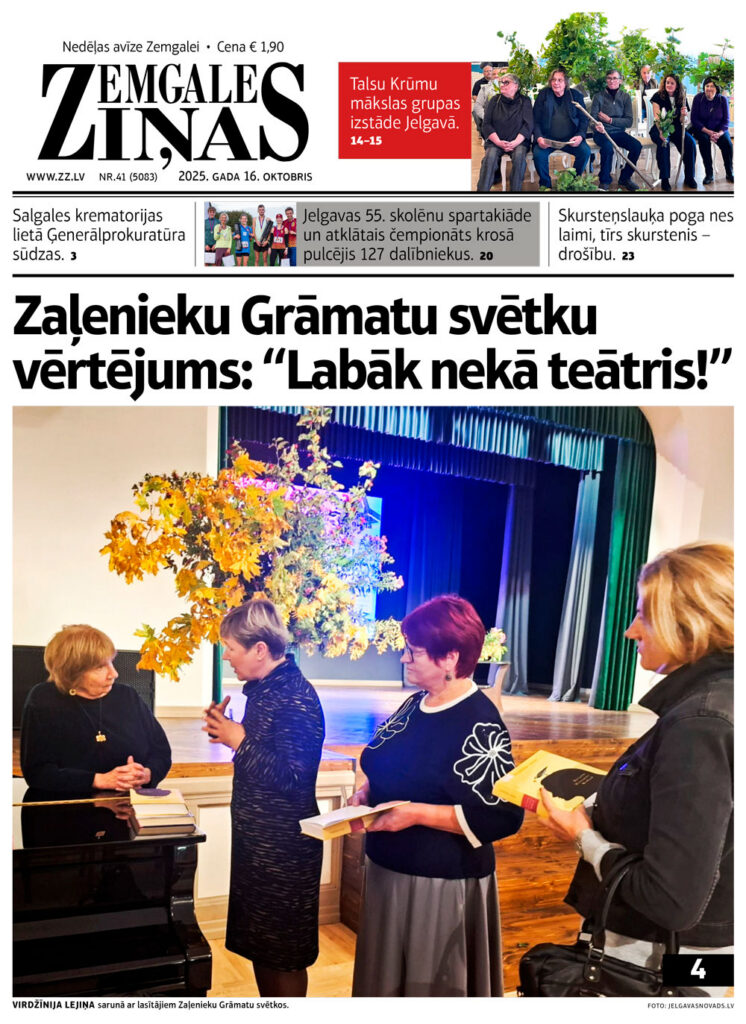 Jaunākajā laikraksta “Zemgales Ziņas” numurā (16.10.2025) lasiet: *Talsu Krūmu mākslas grupas izstāde Jelgavā. *Zaļeniekos grāmatu svētkos uz skatuves Džena Andersone un Viržīnija Lejiņa. *Žurnālista piezīmes: Vispirms cilvēks, pēc tam – dokumenti. *“Vilkaču mantinieces” autorei Ilonai Elvīrai Leimanei – 120. *Ģenerālprokuratūra sūdzas par Administratīvās rajona tiesas Jelgavas tiesu nama lēmumu. *Abgunstes muižā svin “Oktoberfest”.