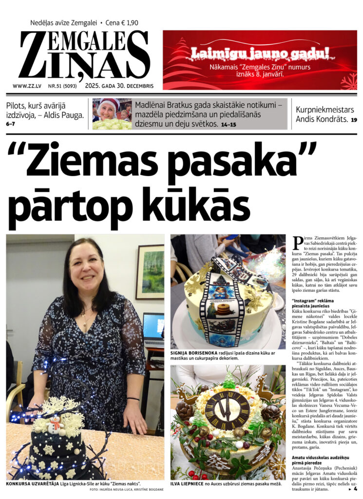 Jaunākajā laikraksta “Zemgales Ziņas” numurā (30.12.2025) lasiet: *Kurpniekmeistars Andis Kondrāts. *Pilots, kurš avārijā izdzīvoja, – Aldis Pauga. *“Ziemas pasaka” pārtop kūkās. *Saruna ar interešu izglītības skolotāju Madlēnu Bratku. *Varonībai ir sievietes seja. Rita Aksenoka. *Ozolnieku vidusskolas bērni cīnās pret mikrobiem. *Saruna ar Valgundes sporta bāzes vadītāju Sarmīti Belti.