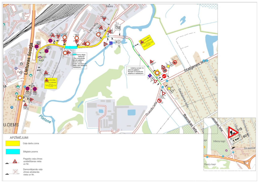 Slēgtajā posmā gājēju kustība tiks nodrošināta pa vienu ielas malu. Apbraukšana paredzēta pa Graudu ielu.