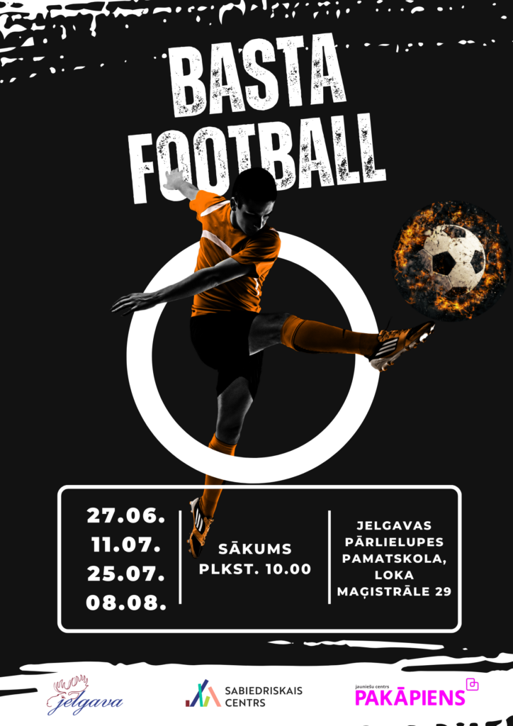 27. jūnijā pulksten 14 Pārlielupes pamatskolas sporta stadionā, Loka maģistrālē 29, notiks pirmais no šīs vasaras četriem bezmaksas futbola turnīriem “Basta Football”. Turnīrā aicināti piedalīties bērni un jaunieši no septiņiem līdz 25 gadiem, informē Jelgavas Sabiedriskais centrs.