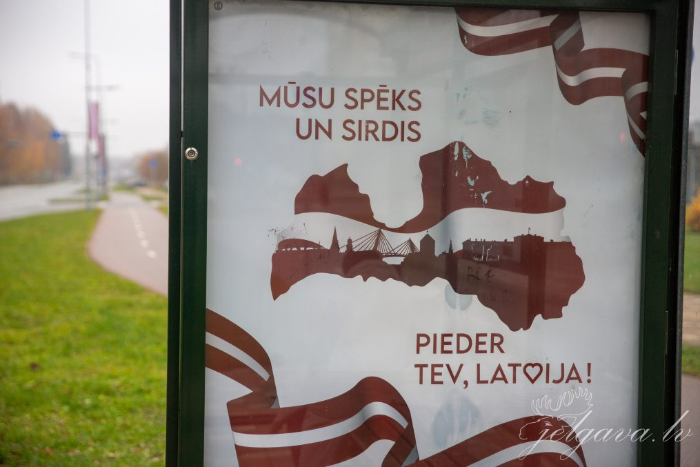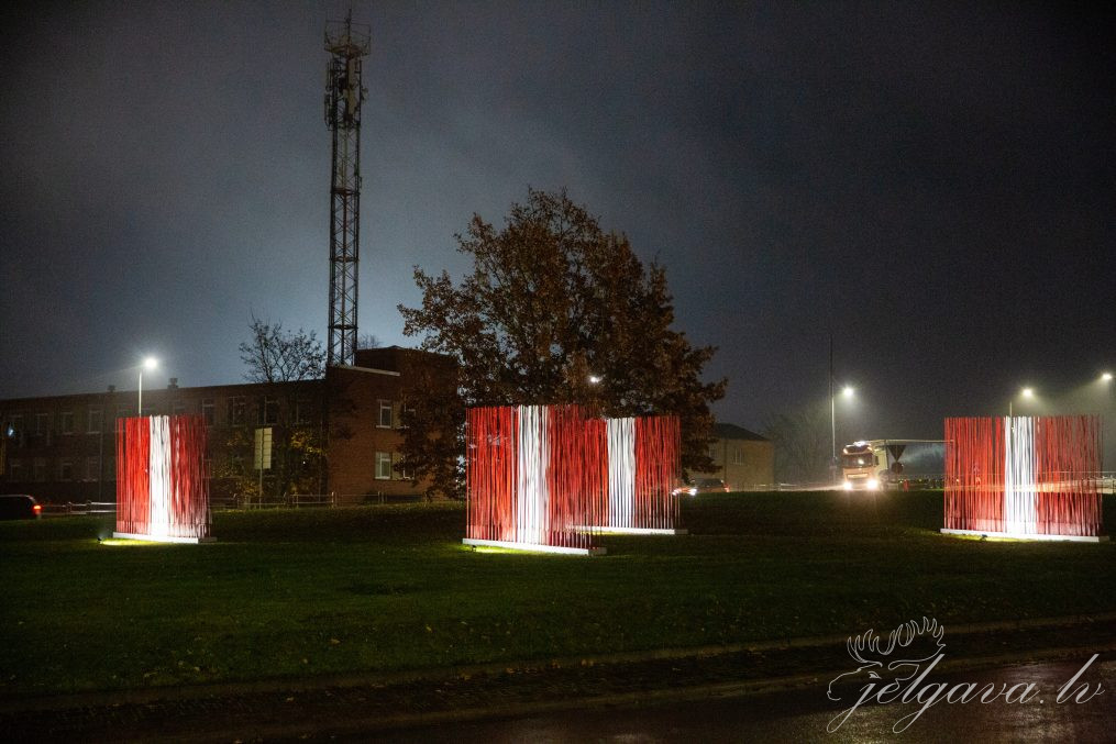 “Pilsētsaimniecība” informē, ka Hercoga Jēkaba laukumā uzstādītas piecas izgaismotas karogu dekoru konstrukcijas, kā arī karogu dekori pie apgaismes balstiem gar ietvi, kas ved uz Jelgavas kultūras namu. Lielās ielas apgaismes balstos kopš maija plīvo baneri valsts un Jelgavas karoga krāsās, bet Loka maģistrālē pirms valsts svētkiem uzstādīti jauni Latvijas karogi.