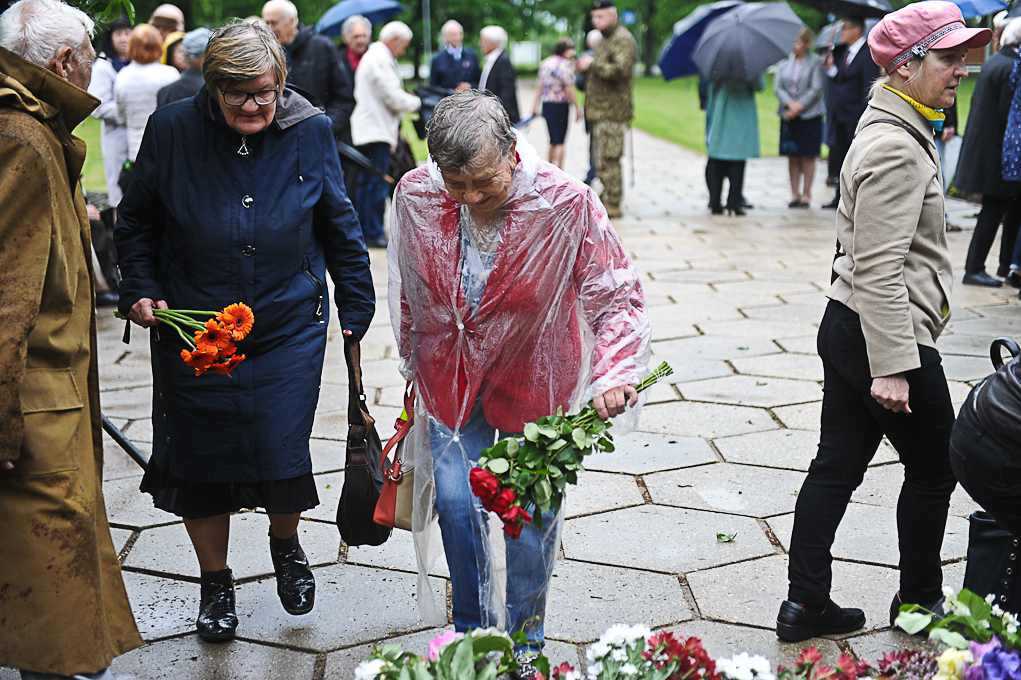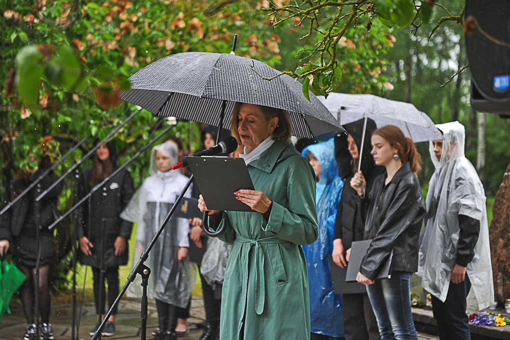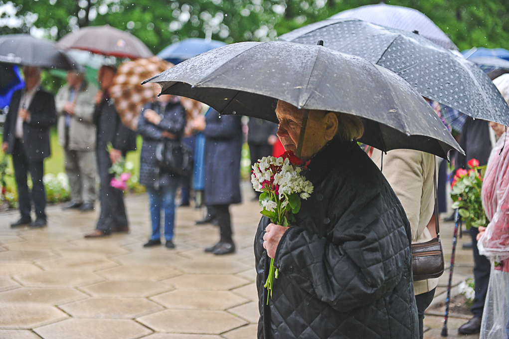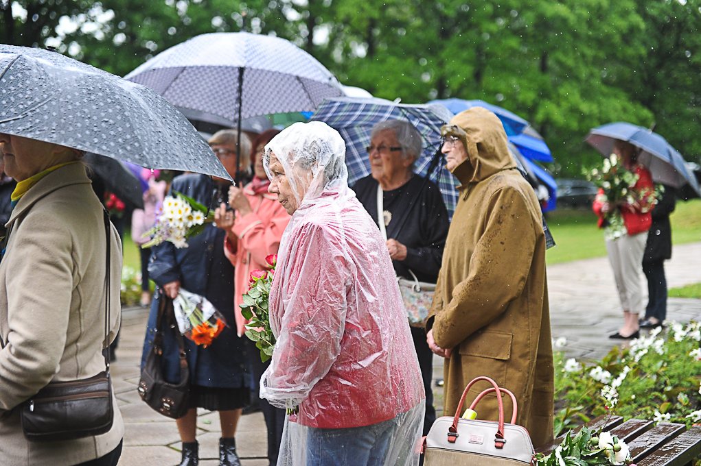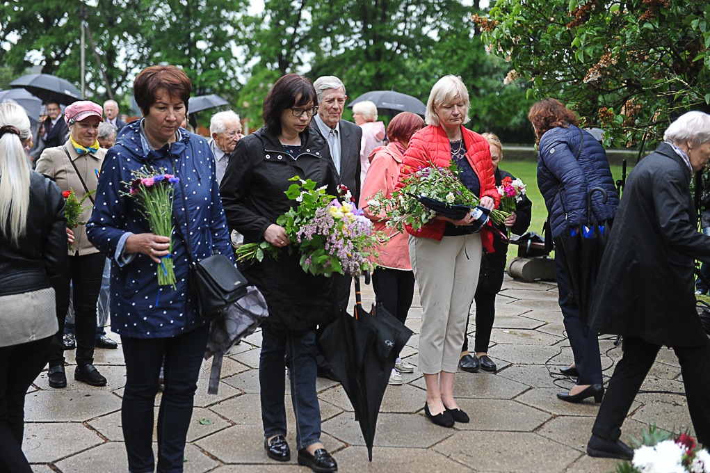 Piemiņas brīdī piedalījās arī Nacionālās pretošanās kustības dalībniece Irēna Kalniņa, kas 1949. gadā tika tiesāta un izcieta sodu par nacionālo partizānu atbalstīšanu. Viņa atcerējās, ka 1989. gadā, iekārtojot Svētbirzi, “staburadzieši” pirms 14. jūnija piemiņas sarīkojuma pļāvuši zāli. Agrāk piemiņas memoriāla vietā bijusi vienkārša pļava. I. Kalniņa nevar pieņemt to, ka pasaule tik ilgi nevar apturēt Krievijas agresiju Ukrainā, kur cieš nevainīgi cilvēki.