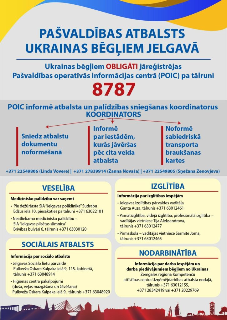 Pašvaldība atgādina, ka visiem Ukrainas iedzīvotājiem, kuri patvērumu raduši Jelgavā, obligāti ir jāreģistrējas POIC, zvanot pa iedzīvotāju atbalsta tālruni 8787. POIC apkopo informāciju gan par bēgļu skaitu, gan viņiem nepieciešamo atbalstu, lai tālāk strukturēti varētu sniegt katram individuālu atbalstu. “Lai veiksmīgāk noritētu informācijas aprite un palīdzības sniegšana, pašvaldībā ir izveidots informācijas koordinācijas centrs, kā arī noteikti koordinatori atbalsta un palīdzības sniegšanai darbā ar uzņemtajiem ukraiņiem. Viņi apzina vajadzības un sazinās ar bēgļiem, kuri atrodas Jelgavā, lai viņiem palīdzētu jebkurā jautājumā,” tā G.Reinsons.