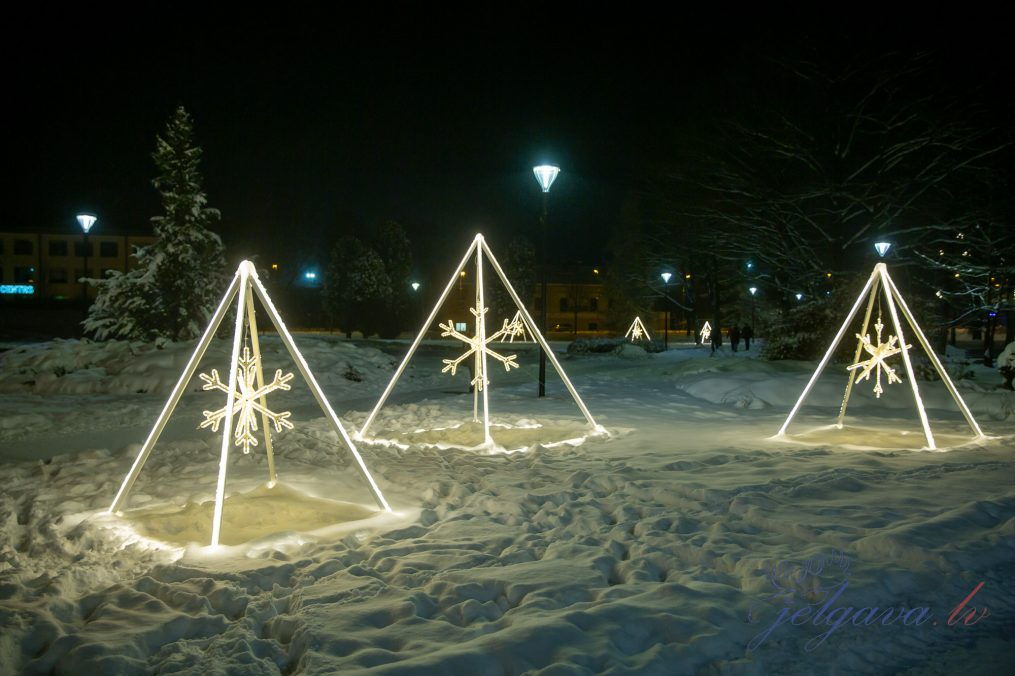 Dažādu izmēru izgaismoti puzuri ar mirdzošām sniegpārsliņām balstos un uz zemes apskatāmi Stacijas parkā. Sarkanbaltsarkani auseklīši dienas tumšanā daļā iedegsies balstos un Pasta ielas rotācijas aplī un Stacijas ielā.