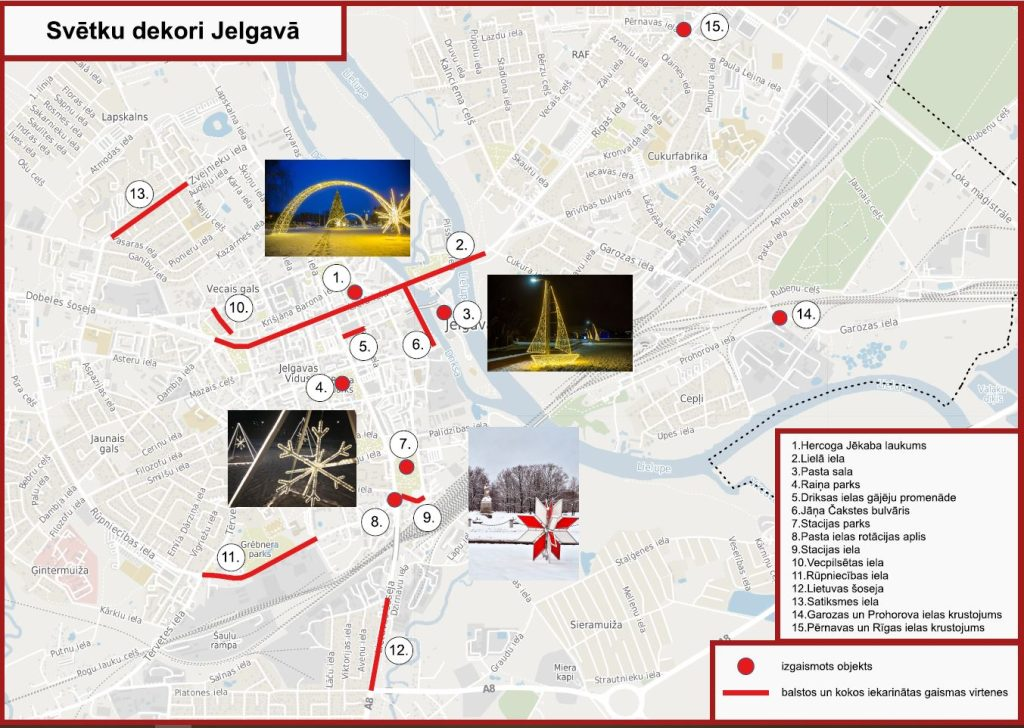 Lielajā ielā, Rūpniecības ielā, Satiksmes ielā, Lietuvas šosejā, kā arī Garozas un Prohorova ielu krustojumā un Pērnavas un Rīgas ielu krustojumā koku zaros un uz balstiem mirdzēs gaismas virtenes.