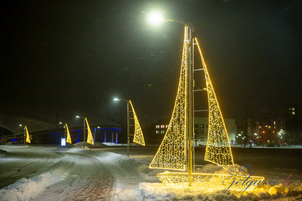 Pasta salā izgaismosies telpisks buru kuģītis un mirdzošas buras formas dekoriem pie apgaismes balstiem. Jāņa Čakstes bulvāra kokos spīdēs izkarinātas gaismas virtenes.