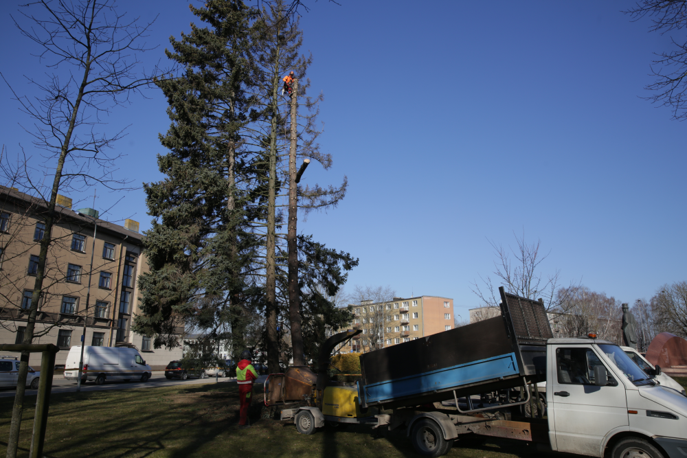 Šodien tiek veikta šo egļu nozāģēšana, bet rīt paredzēts sākt egļu celmu frēzēšana un pēc darbu pabeigšanas vieta zālienā tiks sakārtota. Jāņa Čakstes pieminekļa apkārtnē plānoti arī jauni stādījumi.
