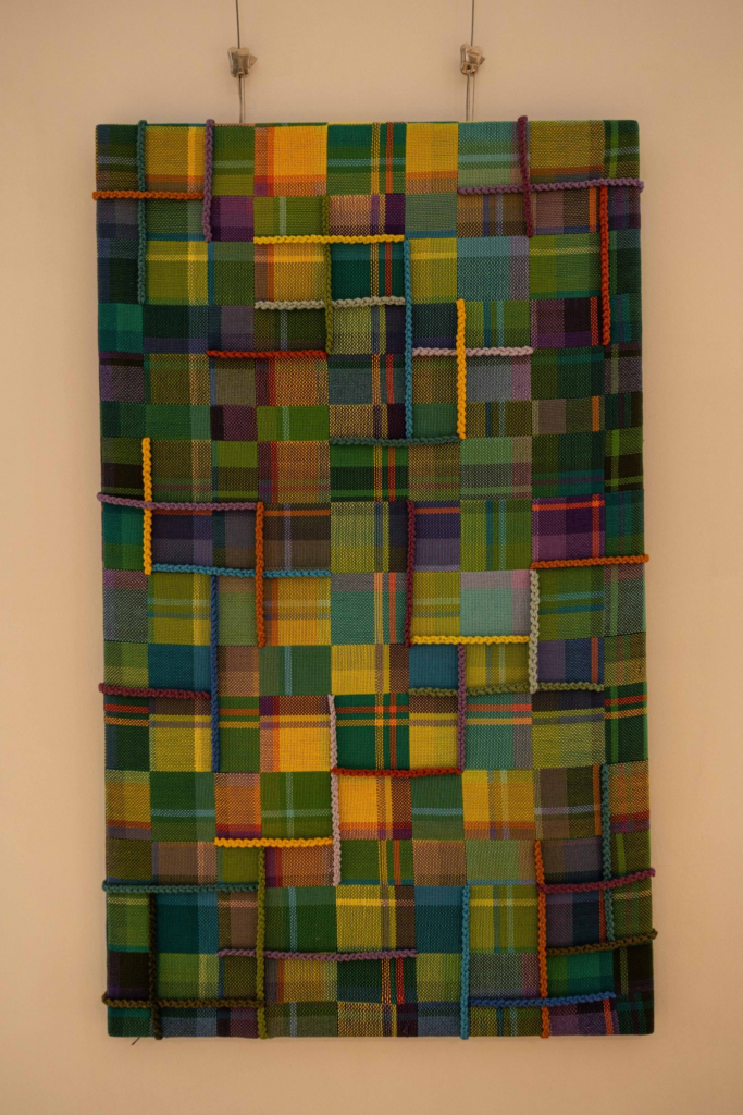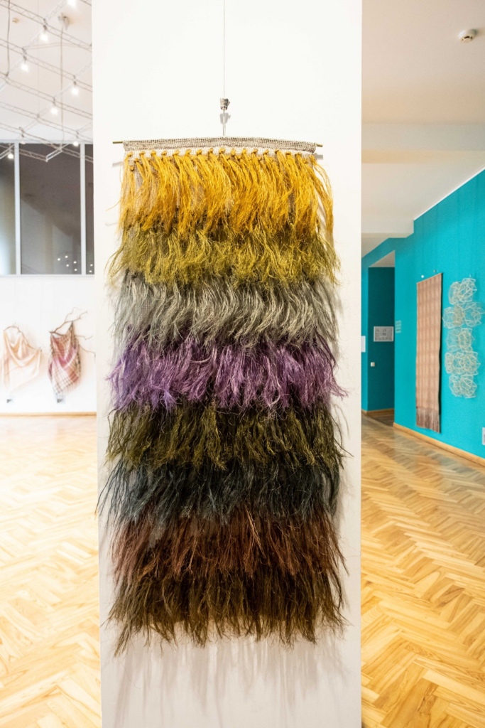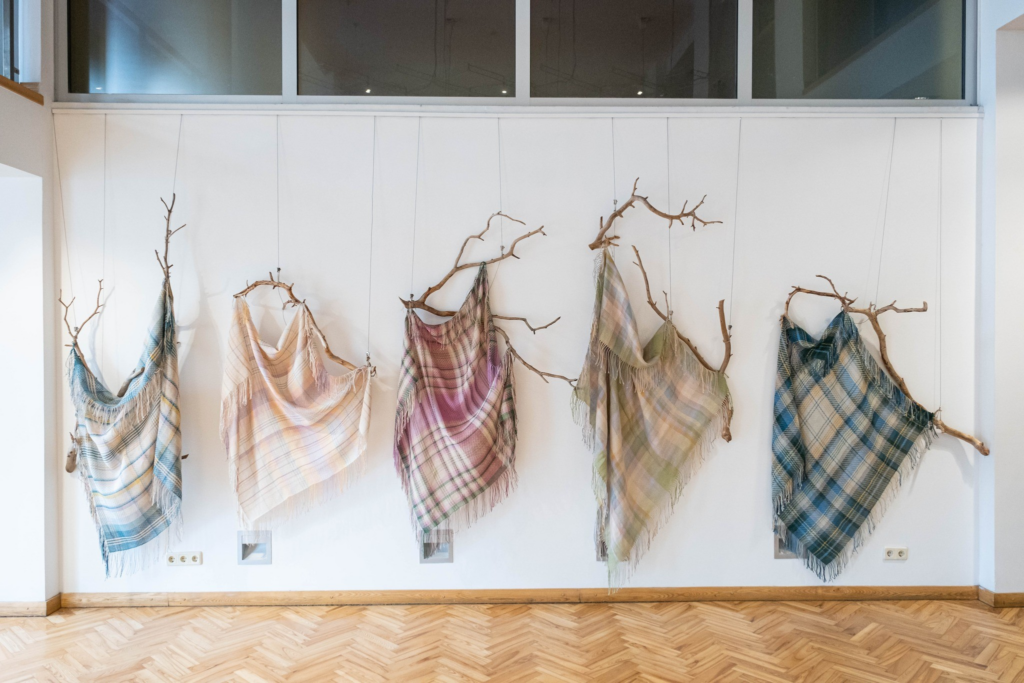 “Vēlējāmies radīt pavasarīgu, gaišu un virmojošu sajūtu,” saka studijas ilggadējā vadītāja Ingrīda Ozolniece. Tāpēc izstādes darbiem izmantoti “vieglāki” materiāli – lins un kokvilna.