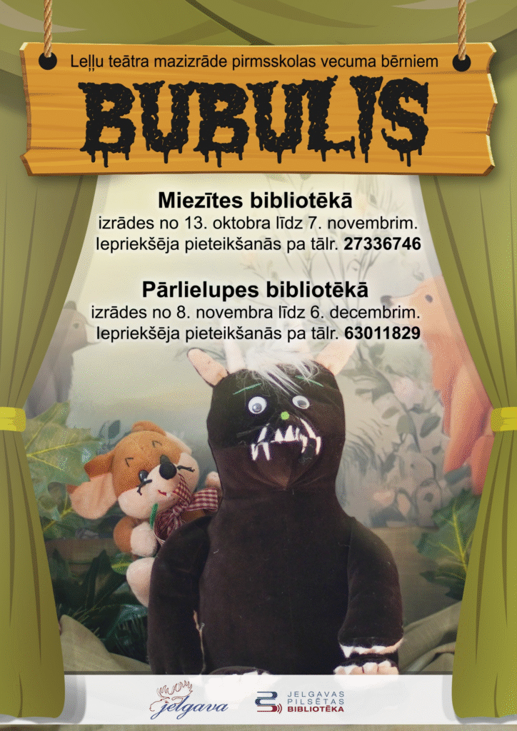 Oktobrī, novembrī un decembrī Miezītes un Pārlielupes bibliotēkas aicina pirmsskolas izglītības iestādes pieteikties leļļu teātra mazizrādei “Bubulis”. Pēc izrādes noskatīšanās bērniem būs iespēja darboties arī praktiski, informē Jelgavas Pilsētas bibliotēka.