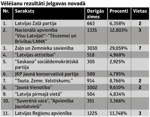 Jelgavas novada domē ievēlētas sešas partijas, un visvairāk balsu jeb 29,059 % saņēmusi Zaļo un Zemnieku savienība (ZZS), iegūstot septiņus deputātu mandātus.