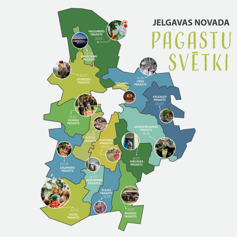 Valgundes pagasta svētkiem sekos Glūdas pagasta svētki, kas norisināsies 1. jūnijā, 5. jūlijā notiks Salgales pagasta svētki, 19. jūlijā svētki gaidāmi Sesavas un Vircavas pagasta, bet 26. jūlijā – Ozolnieku, Lielplatones un Līvbērzes pagastā. Kalnciema un Svētes pagastā svinēs 2. augustā, Platones pagastā – 9. augustā, Cenu un Elejas pagastā – 16. augustā, bet Zaļenieku pagastā 30. augustā. Savukārt 14. septembrī svētki notiks Jaunsvirlaukas pagastā. Svētku maratonu noslēgs pasākums Vilces pagastā 20. septembrī.