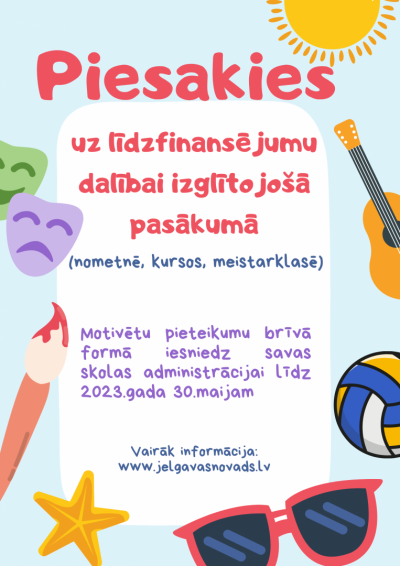 Pieteikumu, kurā aprakstīts izvēlētais pasākums, plānotās izmaksas un paveiktā pamatojums, savas skolas administrācijai jāiesniedz līdz 2023. gada 30. maijam.