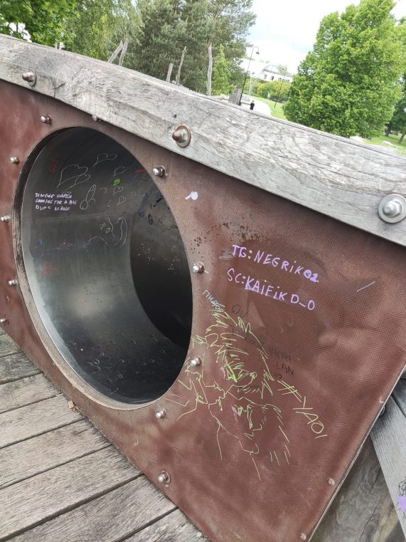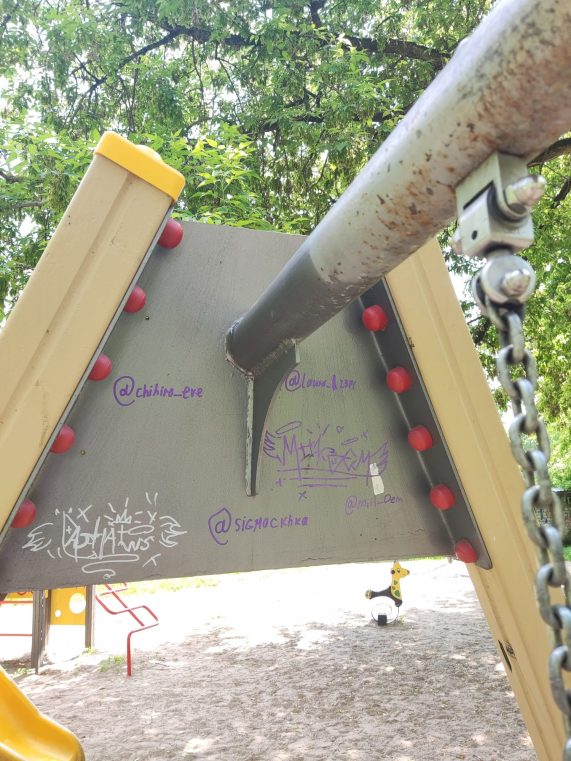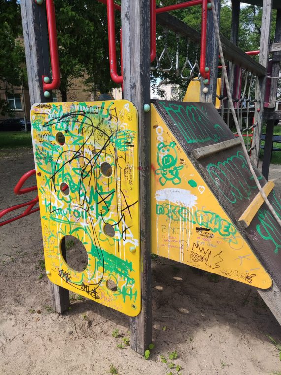 Šovasar jau vairākos rotaļu laukumos, tostarp Uzvaras parkā un Lielajā ielā 15, bijusi nepieciešama iekārtu tīrīšana no apzīmējumiem. Īpaši sarežģīta un dārga ir koka detaļu tīrīšana – iegravētie uzraksti jāizslīpē, tādējādi samazinot detaļu kalpošanas laiku. Vēl grūtāk iztīrāmi ir ieraksti slidkalniņu caurulēs.