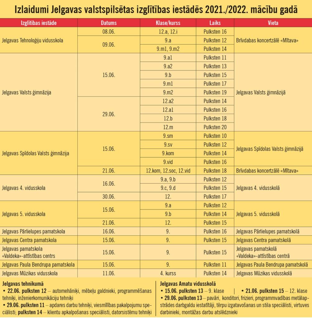 9. un 12. klašu skolēniem vēl norit pēdējie eksāmeni, bet jau šonedēļ Jelgavas skolās sāksies izlaidumi. Pēc Jelgavas Izglītības pārvaldes datiem, 9. klasi pilsētas skolās jāabsolvē 606 skolēniem, tostarp 9. klases izlaidums pirmo reizi būs Jelgavas Centra pamatskolā. Bet 12. klasi un profesionālās izglītības iestādes šogad absolvēs vairāk nekā 600 izglītojamo, informē Jelgavas pašvaldības Sabiedrisko attiecību pārvaldē.
