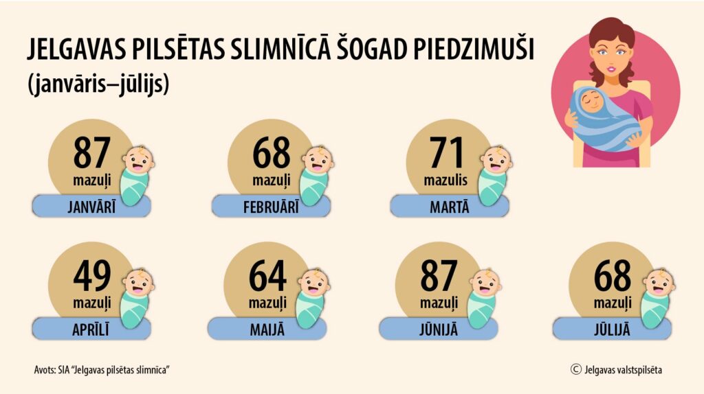 Jelgavas pilsētas slimnīcas Dzemdību un ginekoloģijas nodaļas virsmāsa/galvenā vecmāte Elīna Tipuka stāsta, ka no šogad slimnīcā piedzimušajiem 500 mazuļiem, kuru vidū ir arī divi dvīņu pāri, 269 ir meitenes, bet 231 – puika. Visvairāk mazuļu Jelgavas slimnīcā pasaulē nāca janvārī un jūnijā – katrā 87 bērni.