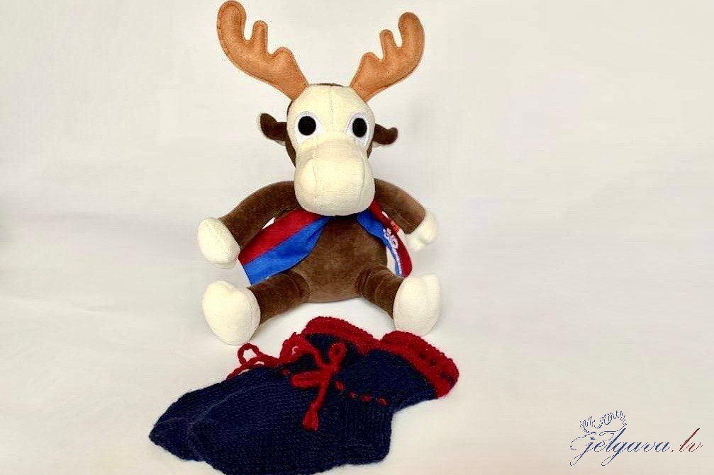 Vitālijam nogādāta pašvaldības dāvana – pilsētas simbols Alnītis un vilnas zeķītes Jelgavas karoga krāsās.