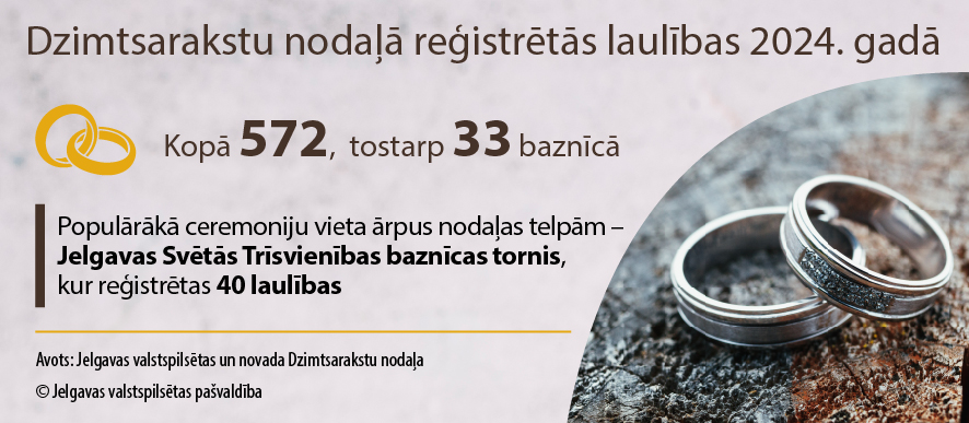 Jāpiebilst, ka pagājušā gada maija izskaņā Jelgavas valstspilsētas un novada Dzimtsarakstu nodaļa apmeklētājus sāka pieņemt jaunajā ēkā Pasta ielā 32 un pirmās laulības šajā ēkā tika reģistrētas 2024. gada 31. maijā. Tāpat kā iepriekšējos gados, pāri jāvārdu izvēlējušies teikt arī ārpus nodaļas telpām. Populārākā vieta laulības reģistrācijai ārpus nodaļas telpām Jelgavā jau vairākus gadus ir nemainīga – Jelgavas Svētās Trīsvienības baznīcas torņa skatu laukums. Tur aizvadītajā gadā reģistrētas 40 laulības.