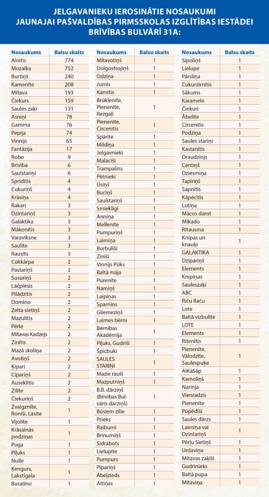 Noslēdzies iedzīvotāju balsojums par jaunās pašvaldības pirmsskolas izglītības iestādes Brīvības bulvārī 31A nosaukumu. Laika posmā no 15. līdz 30. novembrim jelgavnieki mājaslapā www.jelgava.lv kopumā 2979 reizes nobalsoja par kādu no piedāvātajiem nosaukuma variantiem vai ierosināja savu. Visbiežāk – 774 reizes – iedzīvotāji balsojuši par nosaukuma variantu “Alnītis,” informē Jelgavas pašvaldības Sabiedrisko attiecību pārvaldē.