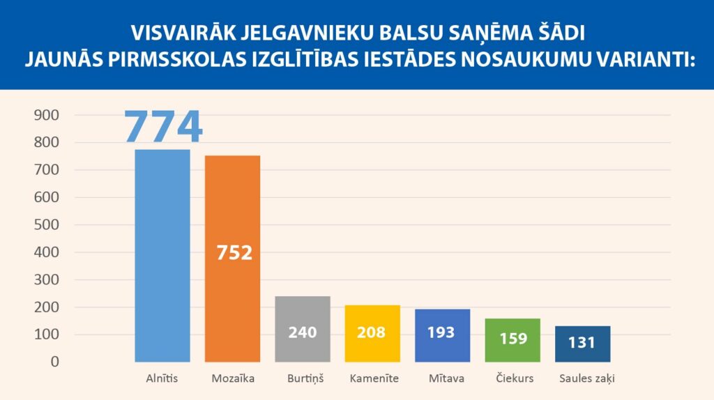 Taču vislielāko iedzīvotāju atbalstu saņēma nosaukuma variants “Alnītis” – par to nobalsots 774 reizes. Ņemot vērā jelgavnieku balsojuma rezultātus, bērnudārzam Brīvības bulvārī 31A tiks rosināts apstiprināt nosaukumu “Alnītis”.