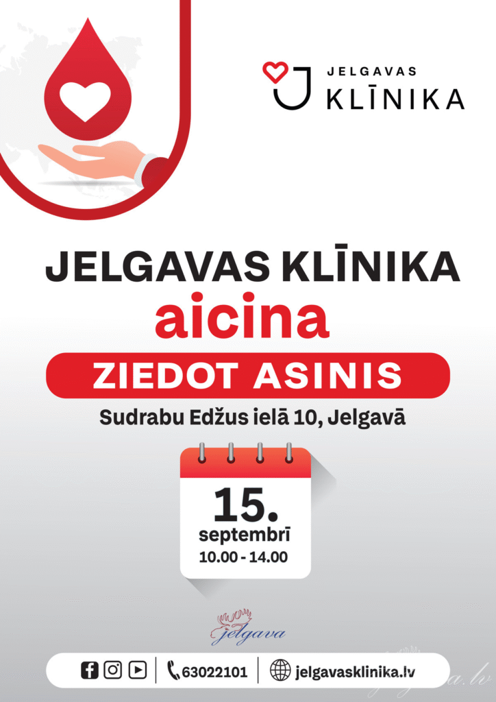 SIA “Jelgavas klīnika” sadarbībā ar Valsts asinsdonoru centru (VADC) aicina jelgavniekus 15. septembrī no pulksten 10 līdz 14 piedalīties Donoru dienā un ziedot asinis. Donori tiks pieņemti specializētajā autobusā pie klīnikas Sudrabu Edžus ielā 10, informē pilsētas pašvaldība.