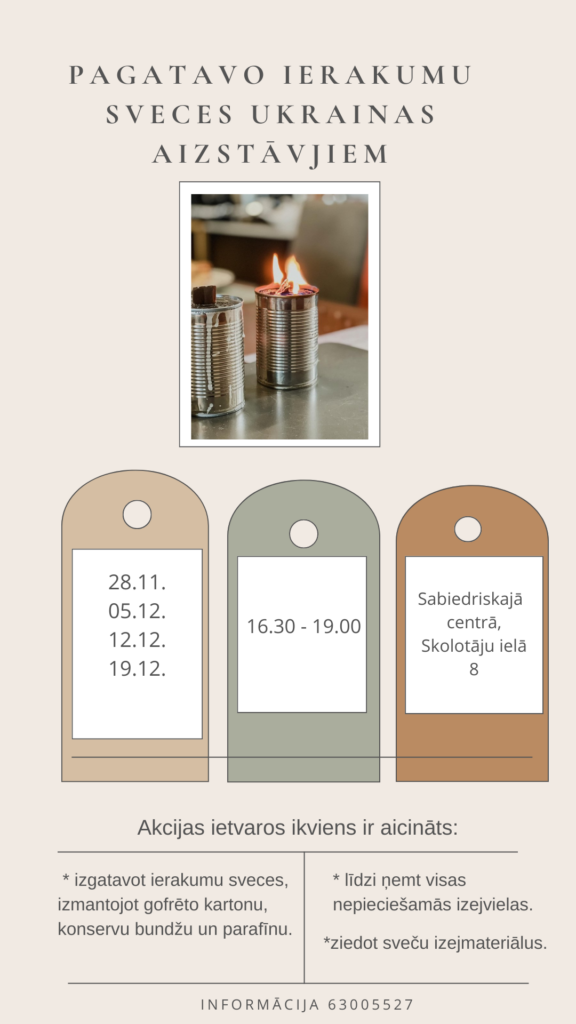Jelgavas pašvaldības iestāde “Sabiedriskais centrs” aicina iedzīvotājus iesaistīties akcijā – izgatavot ierakumu sveces, kas tiks nogādātas Ukrainā valsts aizstāvju vajadzībām. Sabiedriskajā centrā Skolotāju ielā 8 katru pirmdienu notiks ierakumu sveču izgatavošanas darbnīcas. Plānots, ka akcija turpināsies līdz 2023. gada sveču mēnesim – februārim, informē “Sabiedriskais centrs”.