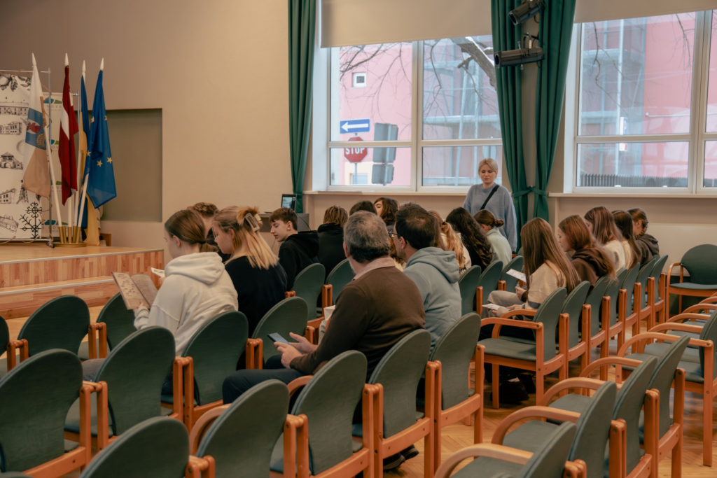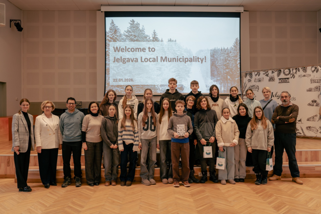 Lai bagātinātu ārzemju viesu izpratni par Jelgavas novadu un pašvaldības darbu, skolēni viesojās arī pašvaldības ēkā.
