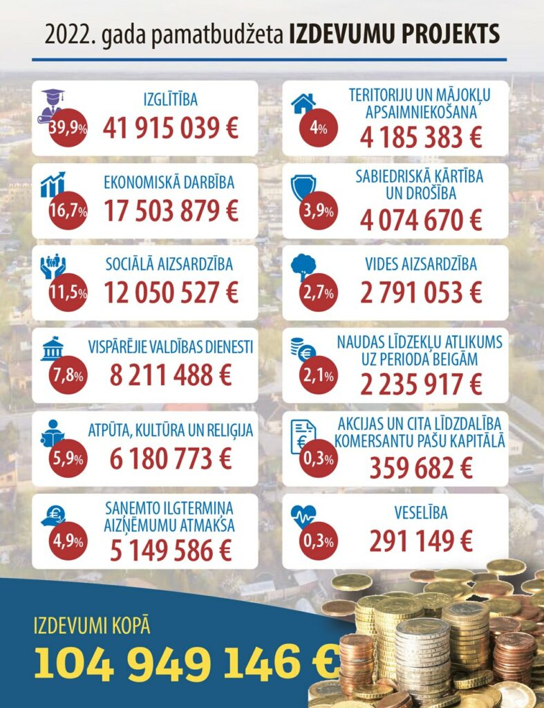 Nemainīga prioritāte budžetā ir izglītība, kur kopējie izdevumi sasniedz 42miljonus eiro. Papildus lielo projektu realizācijai un visu izglītības iestāžu uzturēšanai pašvaldība šogad budžetā paredz arī vairākus citus ieguldījumus. Tā no 1. septembra pirmsskolas izglītībā pedagogu algu likme tiek palielināta no 900 eiro līdz 950 eiro. Pieaugot viena bērna izmaksām pašvaldības bērnudārzos, palielināts arī līdzfinansējums privātajām pirmsskolas izglītības iestādēm līdz 237 eiro par katru bērnu vecumā no pusotra līdz četriem gadiem mēnesī. Tāpat palielināts līdzfinansējums auklēm par vienu bērnu līdz 162 eiro mēnesī.