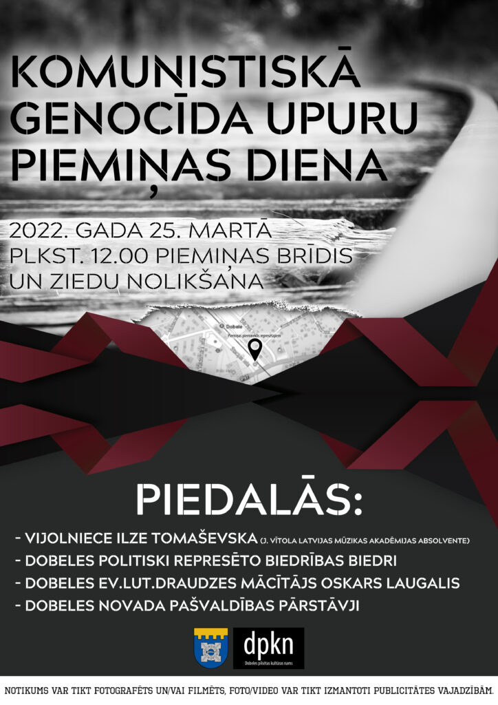 25. martā pulksten 12 pie piemiņas akmens blakus Dobeles dzelzceļa pārbrauktuvei pieminēsim 1949. gada deportācijas un komunistiskā genocīda upurus. Būsim kopā ar tiem, kuri izturēja un atgriezās, informē Dobeles pilsētas kultūras nama kultūras darba menedžere Madara Vinkelmane.