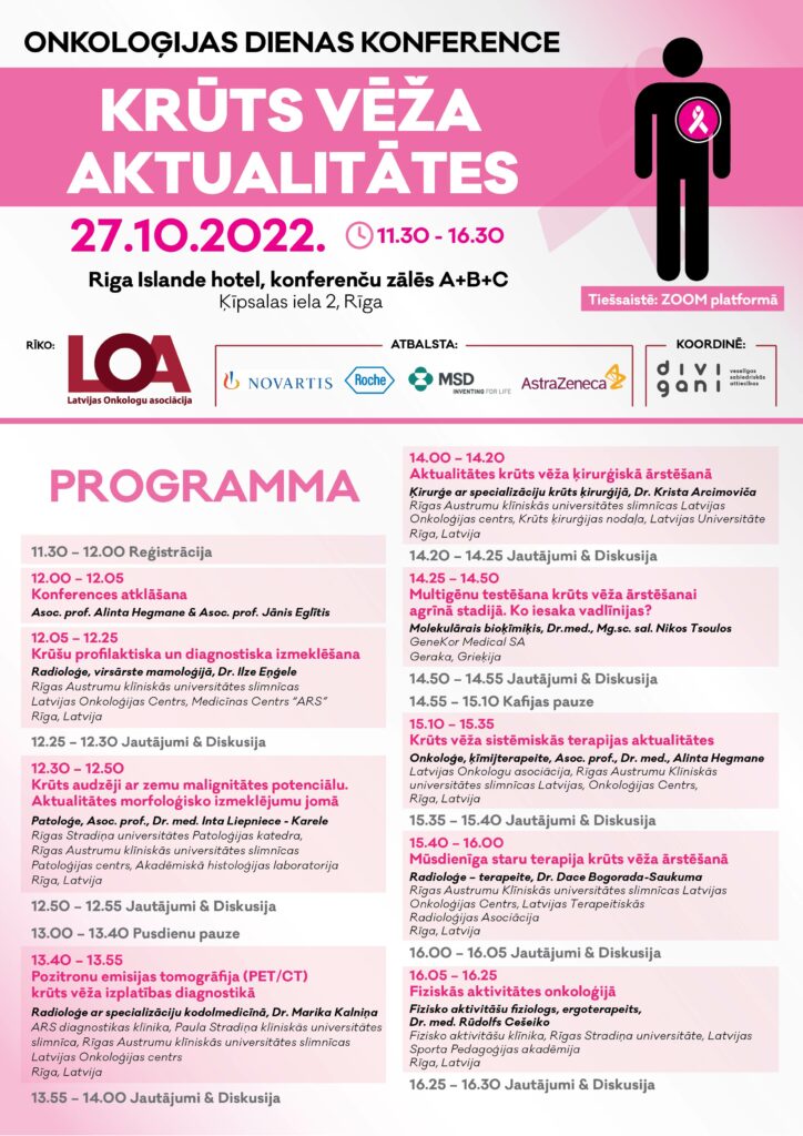 “Krūts vēzis ir biežākais ļaundabīgais audzējs sievietēm Latvijā un krūts vēzis nešķiro – tas var skart ikvienu sievieti. Agrīni atklātu krūts vēzi var izārstēt, metastātisku vēzi iespējams efektīvi ārstēt. Konferencē informēsim par aktualitātēm krūts vēža diagnostikā un ārstēšanā,” skaidro Latvijas Onkologu asociācijas valdes priekšsēdētāja, asociētā profesore Alinta Hegmane.