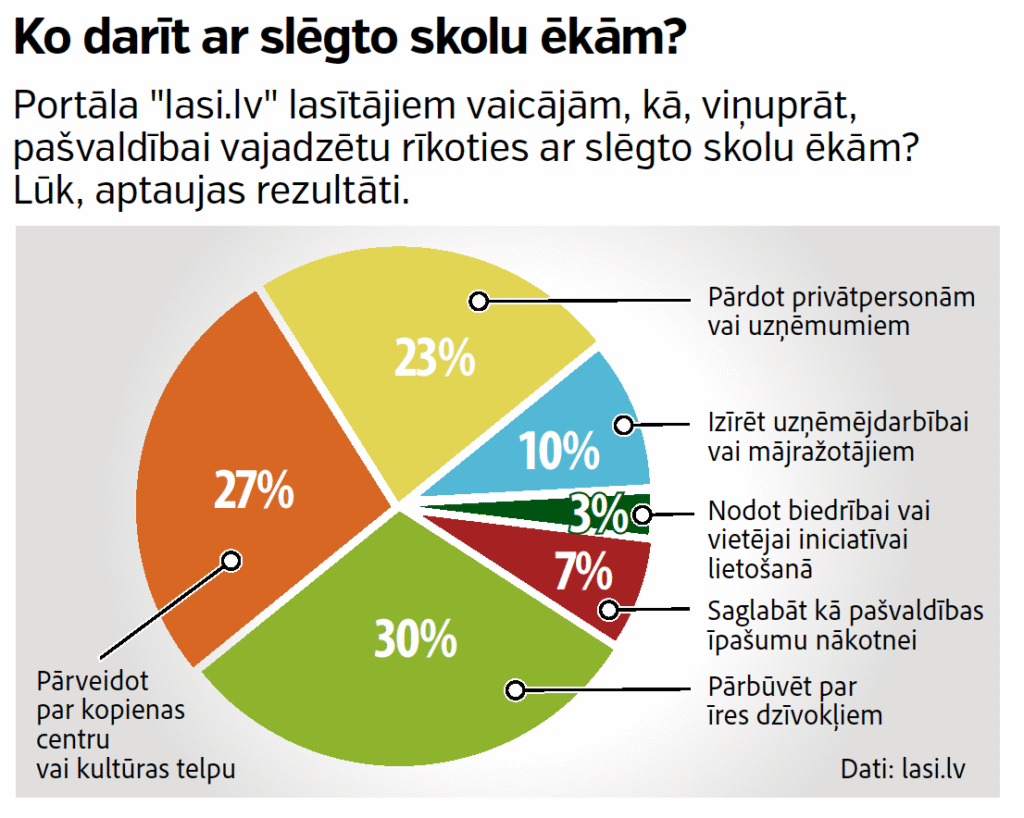 Reģionālie laikraksti “Dzirkstele” “Staburags”, “Brīvā Daugava”, “Bauskas Dzīve”, “Alūksnes un Malienas Ziņas” un “Ziemeļlatvija” kopā ar “Latvijas Avīzi” šovasar interesējās, kas notiek aizvērto skolu ēkās. Secinājums – ir veiksmīgi īstenotas ieceres, kad ēka iegūst jaunu dzīvi, un, protams, ir ne tik iedvesmojoši stāsti.
