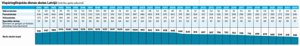 Kopš Latvijas neatkarības atgūšanas skolu skaits ir mainījies, bijuši gadi, kad pat pieaudzis, piemēram, 90. gados daudzviet atvēra, atjaunoja sākumskolas, pamatskolas, no kurām lielai daļai nebija ilgs mūžs. Neatkarīgās Latvijas dzīves ritms un demogrāfiskās izmaiņas reģionos noveda pie daudzu skolu slēgšanas. Centrālās statistikas pārvaldes dati liecina, ka 1991. gadā Latvijā bija 947 vispārizglītojošās dienas skolas. Vislielākais to skaits bijis 1996.–1998. gadā – kopā 1074 skolas. Bet šo gadu laikā tas samazinājies gandrīz divkārt – 2024. gadā uzskaitītas 585 vispārizglītojošās skolas, liecina Centrālās statistikas pārvaldes dati.