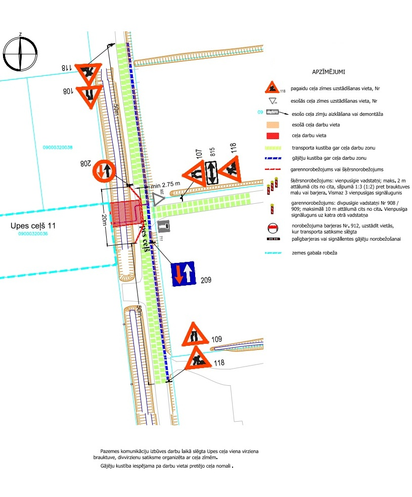 Darbu laikā slēgta Upes ceļa viena virziena brauktuve, divvirzienu satiksme organizēta ar ceļa zīmēm. Gājēju kustība iespējama pa darba vietai pretējo ceļa nomali.