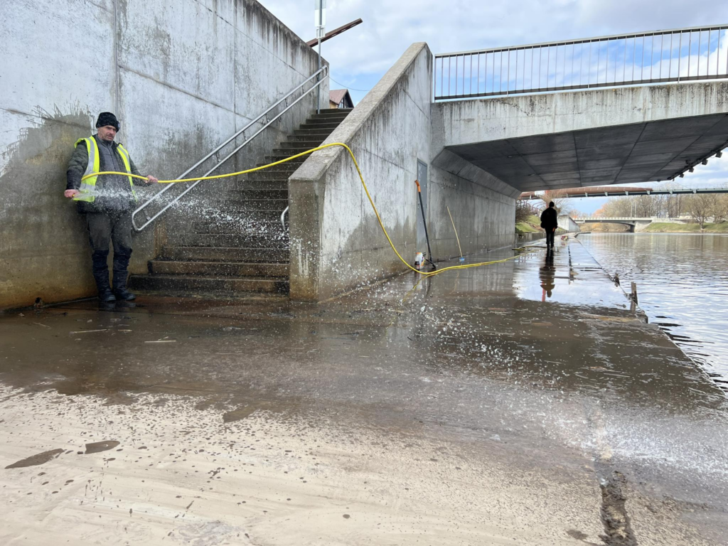 Ar augstspiediena ūdens strūklu tiek mazgāti ziemas un plūdu laikā sanestie dubļi un netīrumi. Papildus inženieri novērtē soliņu stāvokli un apseko pārējos elementus promenādēs.