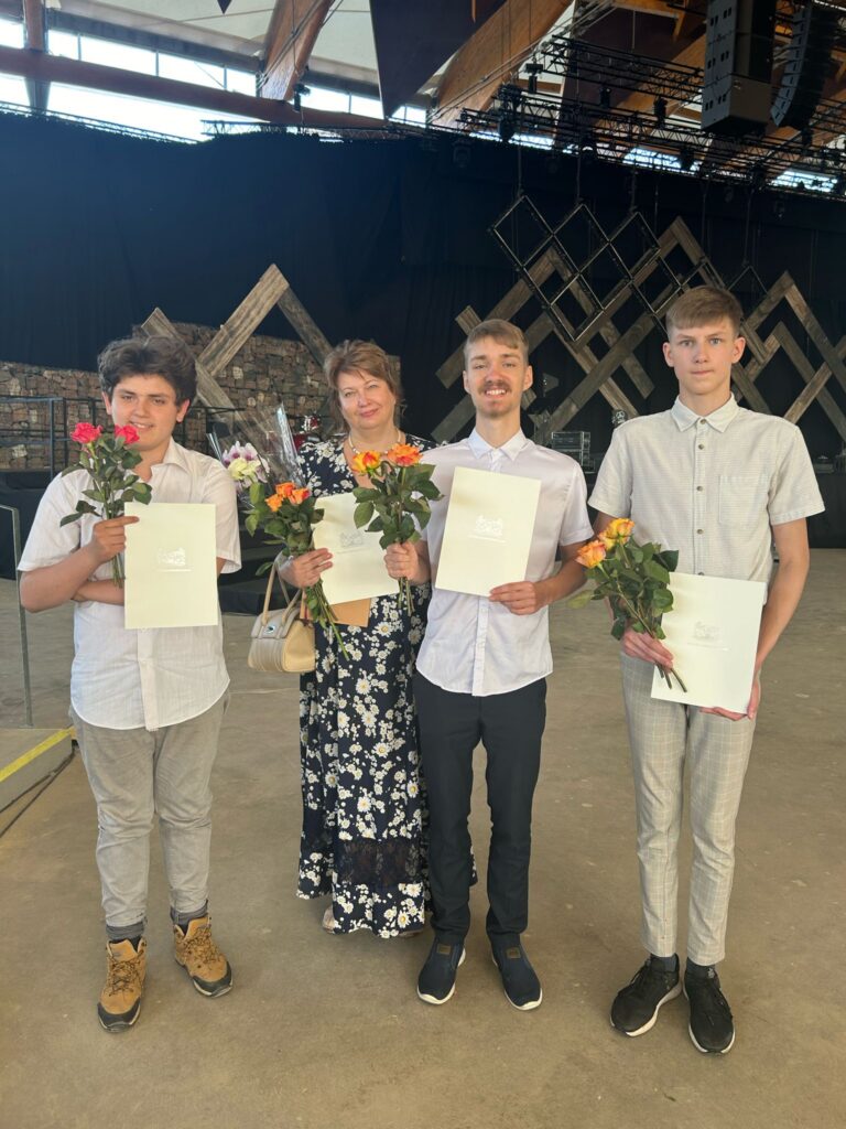 KOPĀ ar saviem talantīgajiem matemātikas olimpiāžu uzvarētājiem Patriku, Ēriku un Pāvelu. “Viņi man matemātikā ienesa jaunas krāsas un skaņas, un arī virsotnes,” atzīst skolotāja.