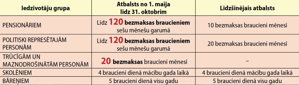 Papildu atbalsts bezmaksas braucieniem pilsētas autobusos no 1. maija būs arī pensionāriem un politiski represētajām personām. Grozījumi saistošajos noteikumos «Brīvprātīgās iniciatīvas pabalsti Jelgavas valstspilsētas pašvaldībā» nosaka, ka tiek palielināts bezmaksas braucienu skaits pensionāriem no 10 braucieniem mēnesī līdz 20 braucieniem mēnesī no 1. maija līdz 31. oktobrim. Vienlaikus gan pensionāriem, gan politiski represētajām personām neizmantotos braucienus būs iespēja izmantot nākamajos mēnešos, un tas attieksies uz laika periodu no šā gada 1. maija līdz 31. oktobrim. Sākot ar 1. maiju, pensionāriem un politiski represētajām personām, kurām līdz 30. aprīlim jau būs piešķirts pabalsts pilsētas sabiedriskā transporta braukšanas maksas segšanai, automātiski tiks nodrošināta iespēja izmantot sabiedriskā transporta pakalpojumus bez maksas līdz 120 braucieniem sešu mēnešu garumā – no 1. maija līdz 31. oktobrim.