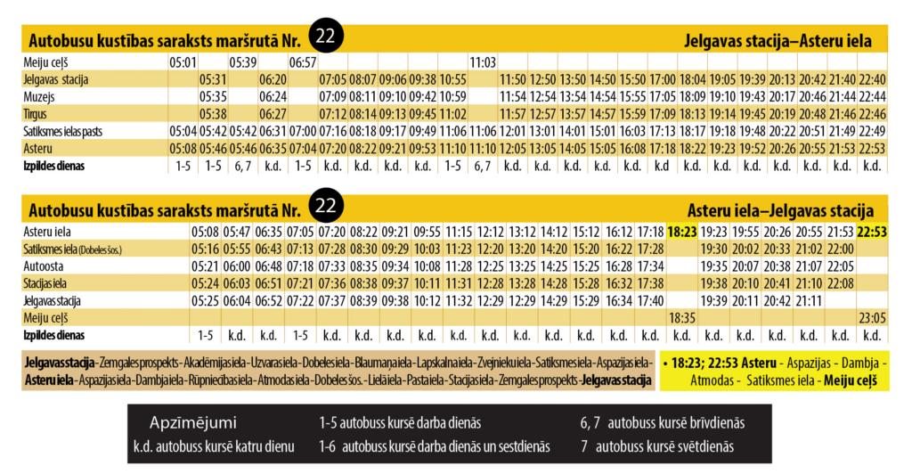 Savukārt 22. maršrutā Asteru iela–Jelgavas stacija, veicot izmaiņas, kopējais izpildīto reisu skaits par četriem samazinās. Samazinājums saistīts ar reisu izpildes intervāla samazināšanu līdz vienai reizei stundā no pulksten 10 līdz 16, jo šajā laikā arī vilcienu kursēšanas intensitāte no Jelgavas stacijas ir vienu reizi stundā. Vēl pēc iedzīvotāju lūguma reisos pulksten 18.23 un 22.53 Asteru iela–Atmodas iela–Meiju ceļš mainīts reisu izpildes maršruts. Turpmāk norādītie reisi kursēs pa maršrutu Aspazijas iela–Dambja iela–Atmodas iela–Dobeles šoseja–Satiksmes iela–Meiju ceļš, un šajos reisos iekļautas autobusu pieturas “Brigadieres iela”, “Bebru ceļš” un “Atmodas iela”, bet izslēgta autobusu pietura “5. vidusskola”.