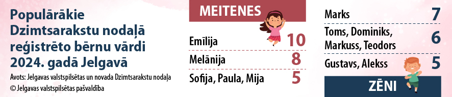 Pēc Dzimtsarakstu nodaļas datiem, pagājušajā gadā populārākais vārds, ko vecāki izvēlējušies meitenēm Jelgavas pilsētā, ir Emīlija, ka dots desmit meitenēm, Melānija, kas dots astoņām meitenēm, un Sofija, Paula un Mija – katrs dots piecām meitenēm. Populārākais Dzimtsarakstu nodaļā reģistrētais vārds zēniem pagājušajā gadā bija Marks, kas dots septiņiem zēniem, Toms, Dominiks, Markuss, Teodors – katrs dots sešiem puišiem -, kā arī Gustavs un Alekss – katrs dots pieciem zēniem.