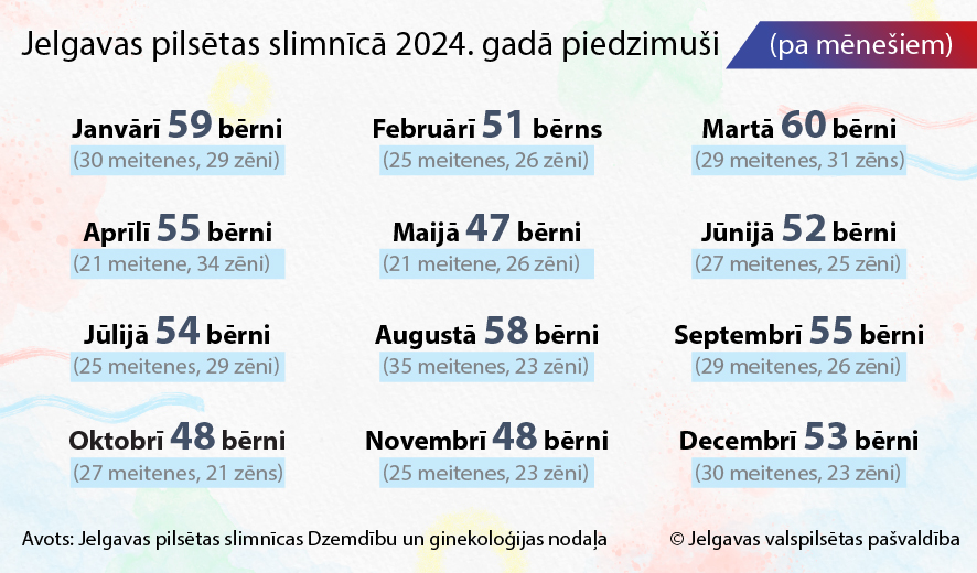 Dzimtsarakstu nodaļā aizvadītajā gadā reģistrēti 374 jelgavnieki – 185 meitenes un 189 zēni. Bet kopumā nodaļā veikti 594 dzimšanas reģistri, tostarp 188 bērni deklarēti Jelgavas novadā, bet 32 jaundzimušie deklarēti citā pašvaldībā.