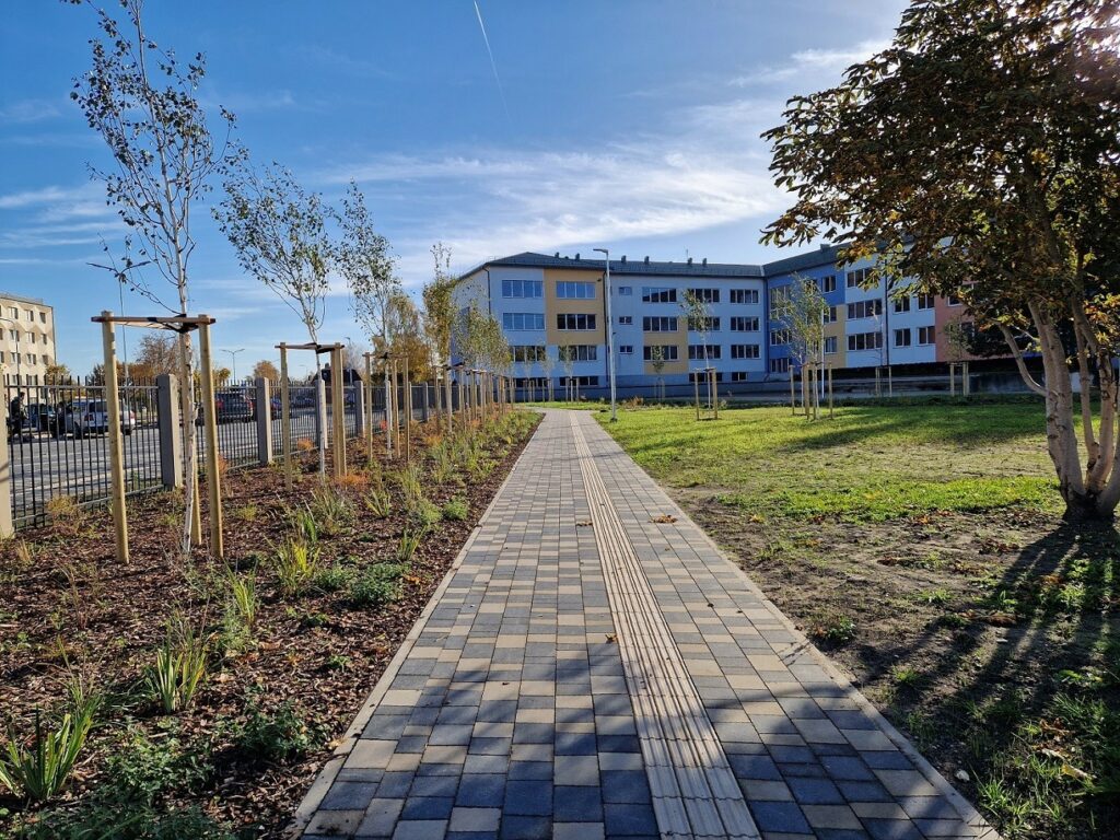 - labiekārtota teritorija – ierīkoti dažādi apstādījumi: iestādītas 15 sudrabkļavas, piecas parastās kļavas, 12 baltmizas Himalaju bērzi un 316 košumkrūmi, kā arī dažādas puķes, izbūvēts jauns žogs paralēli stāvlaukumam, uzstādīti 48 jauni velosipēdu statīvi, kas paredzēti 96 velosipēdiem, soli un atkritumu urnas.