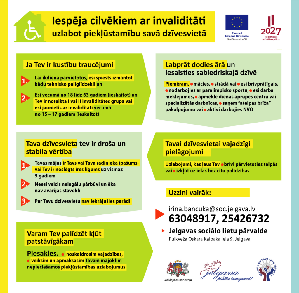 Mērķa grupas personas, kurām ir nepieciešama mājokļa pielāgošana, aicinātas vērsties Jelgavas Sociālo lietu pārvaldē, zvanot pa tālruni 63048917 vai 25426732, vai rakstot pa e-pastu irina.bancuka@soc.jelgava.lv.
