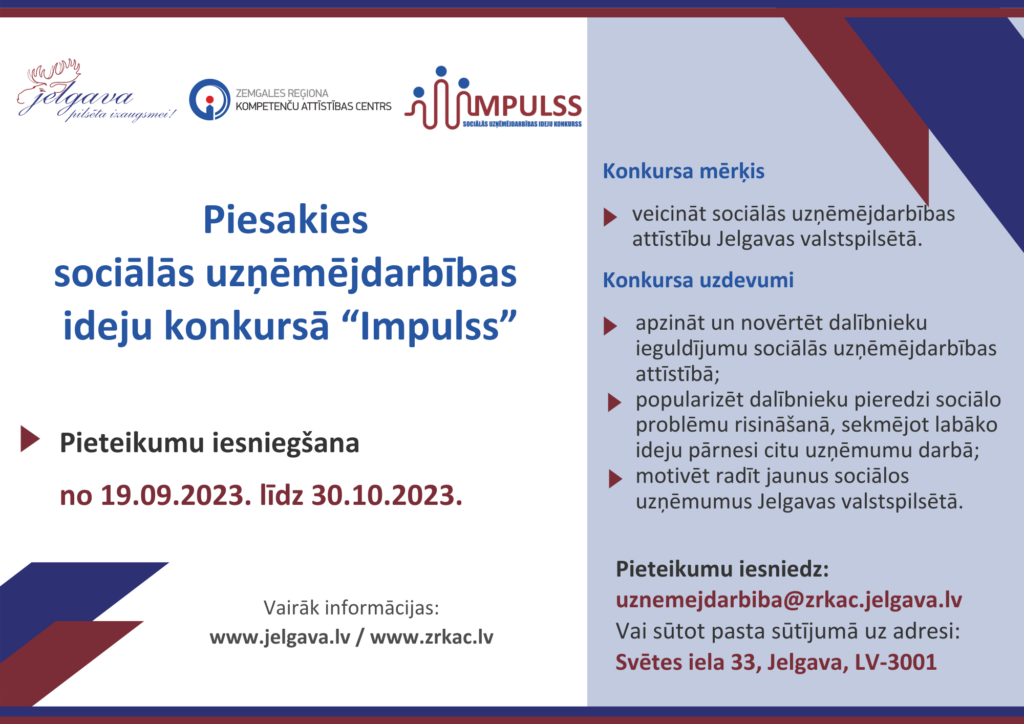 Konkursa nolikums un pieteikuma veidlapa pieejama ziņas pielikumā un www.zrkac.lv. Konkursa pieteikums jāiesniedz, nosūtot elektroniski uz e-pasta adresi uznemejdarbiba@zrkac.jelgava.lv (parakstītu ar drošu elektronisko parakstu) vai pasta sūtījumā uz adresi: Svētes iela 33, Jelgava, LV-3001, uz aploksnes norādot “Sociālās uzņēmējdarbības ideju konkursam “Impulss””.