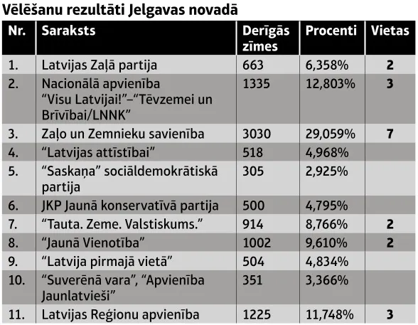 Zīmīgi, ka LZS listē ir deputātu kandidātu vēlētāju atbalsta lēcieni un lejupslīdes. Partijas līderis pirmais numurs Ingus Zālītis no 1. vietas nobraucis uz 7., bet uz 1. no 10. pozīcijas pacēlies uzņēmējs Uldis Caune. No 16. vietas uz 5. pakāpusies arī jaunā Jelgavas novada domes deputāte Lielvircavas kultūras nama vadītāja Rasma Krauze. Pa vienpadsmit pakāpieniem cēlusies arī Sesavas pagasta sporta organizatore Inga Knope, kas par deputāti šoreiz nekļuva – palika pirmā zem strīpas. Jelgavas novada domē nav ievēlēta arī Līga Lonerte, kas no 2. vietas vēlēšanu listē noslīdēja uz 10.