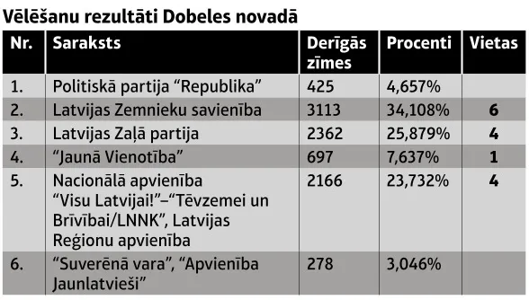Pašvaldību vēlēšanās Dobeles novadā sacentās seši politiskie spēki un tika ievēlēti 15 deputāti. Vēlētāju aktivitāte izrādījās mazliet zemāka nekā vidēji Latvijā – 43%. Uzvarēja LZS ar tās līderi tagadējo Dobeles novada domes priekšsēdētāju Ivaru Gorski vadībā. Tā saņēma 34,11% balsu un ieguva sešus mandātus (Ivars Gorskis, Gints Kaminskis, Dace Reinika, Indra Špela, Guntis Safranovičs, Sintija Liekniņa). Otrajā vietā – Zaļā partija ar 25,88% balsu un līdz ar to četriem mandātiem (Andrejs Spridzāns, Jānis Ozoliņš, Jānis Amsils un Ilze Lesiņa). Trešie – LRA un NA saraksts ar 23,73% balsu un arī četriem mandātiem (Edgars Gaigalis, Kristīne Briede, Andris Podvinskis, Viesturs Reinfelds). Partija “Jaunā Vienotība” Dobelē saņēma 7,64% vēlētāju atbalstu un ieguva vienu mandātu (Edgars Laimiņš). Jelgavā augstu rezultātu guvusī “Suverēnā vara”/“Apvienība Jaunlatvieši” Dobeles novadā palika zem strīpas – netika ievēlēti domē.