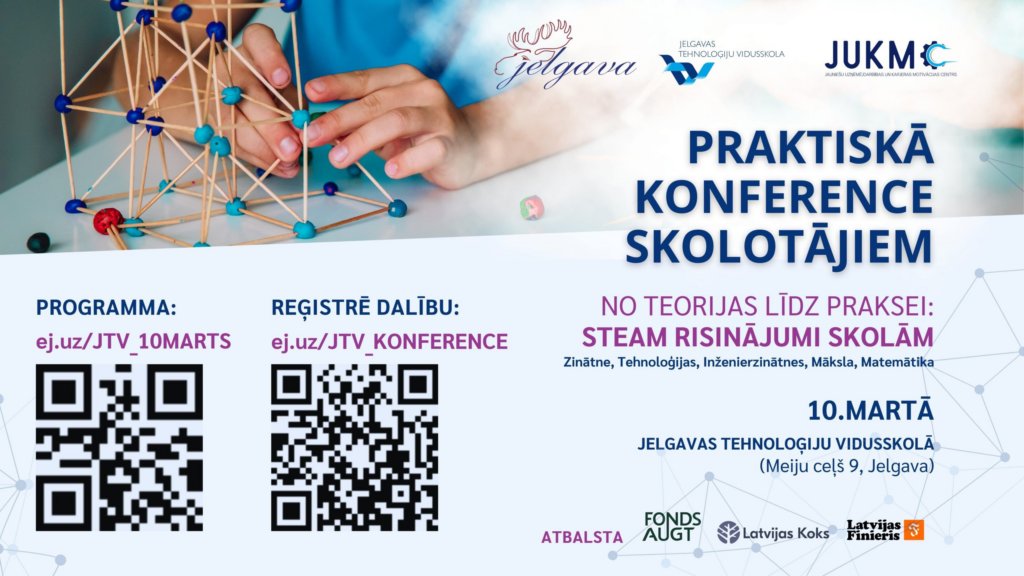 Konferences pirmajā daļā pedagogiem būs iespēja iepazīties ar Jelgavas Tehnoloģiju vidusskolas pieredzi kompetenču pieejā balstītajiem STEAM risinājumiem un skolas pieredzi bērnu un jauniešu jaunrades un uzņēmējspēju veicināšanā.
