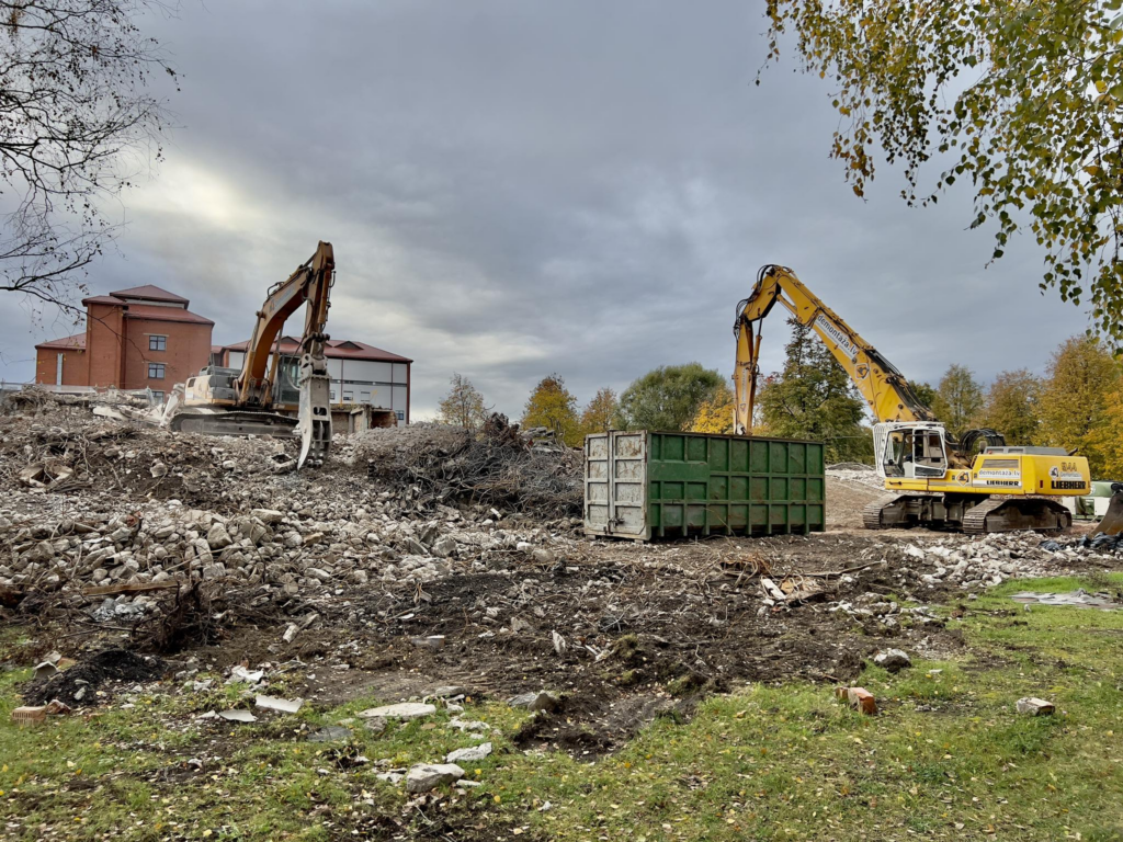 Nojaukšanas darbi vēl turpinās ēkas 1. stāvā, bet vienlaikus būvnieki gatavojas iegūto materiālu pārstrādei. Demontāžas procesā būvgruži tiek šķiroti, no kopējā apjoma atdalot pārstrādei derīgos materiālus, un liela daļa no tiem tiks pārstrādāti turpat objektā.