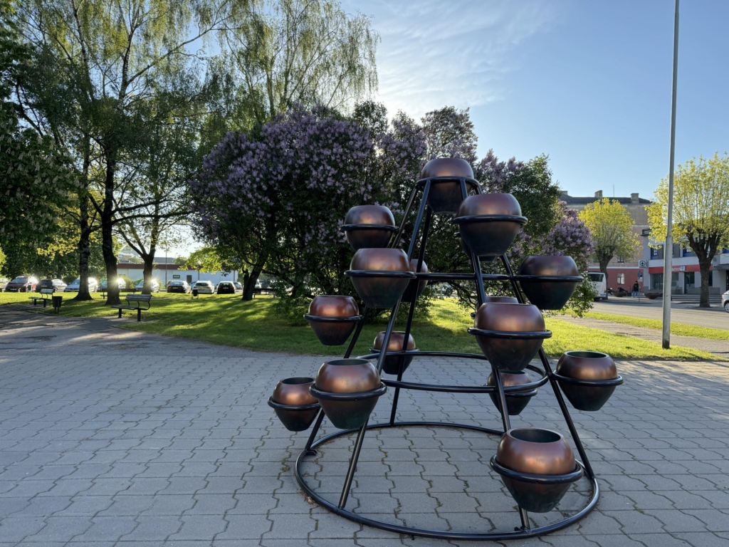 Metāla statīvos izvietoti jauni bumbiera formas puķu podi, kas izgatavoti no betona un nokrāsoti ar divu veidu krāsām, iegūstot bronzas toni. Kopumā nomainīti 36 podi. Iestājoties siltākam laikam, tajos tiks iestādītas vasaras puķes, informē “Pilsētsaimniecība”.